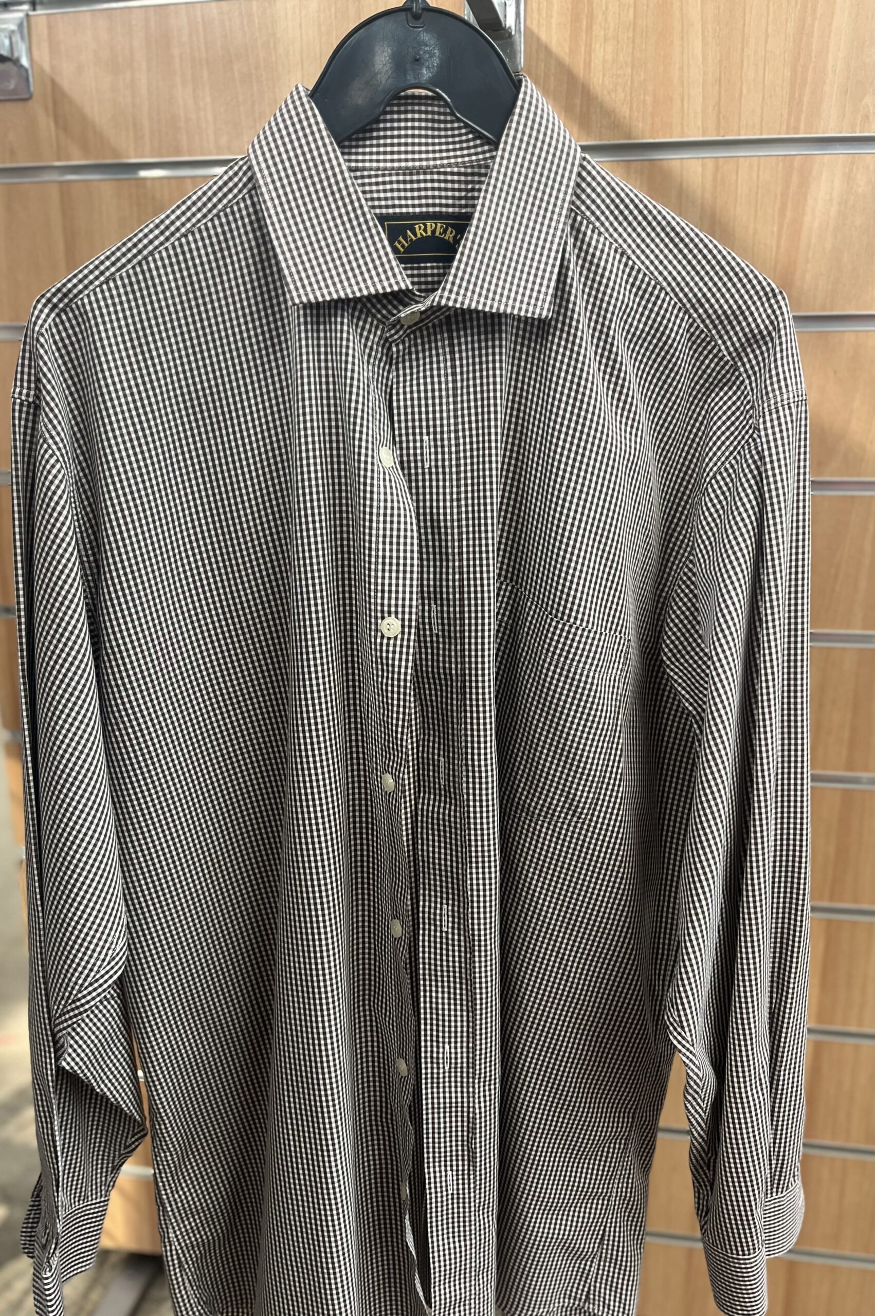 Chemise à petit carreaux gris et blanc.