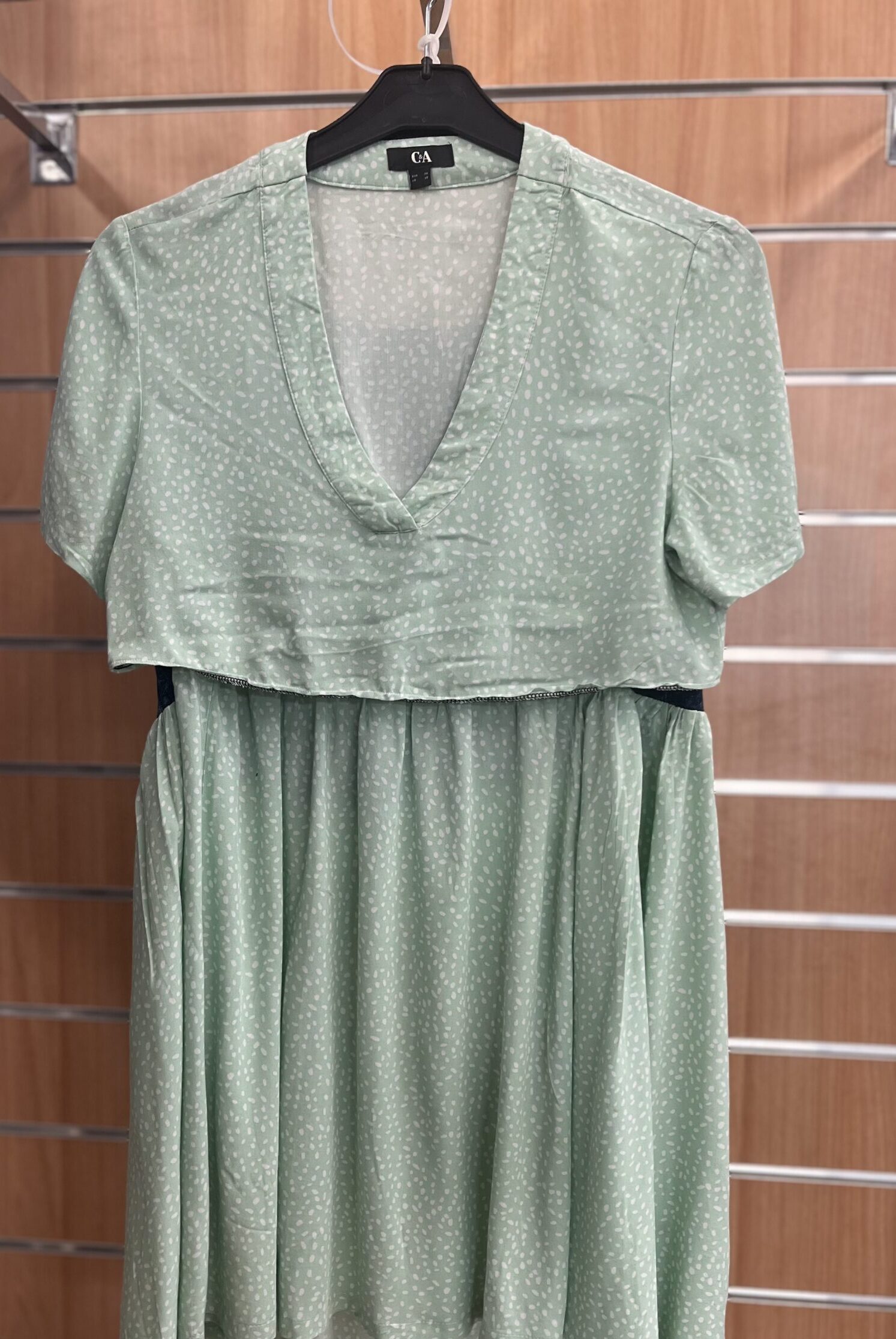 Ensemble haut + jupe évasée à petits pois de tissus recyclés de couleur vert d’eau et blanc. Taille 36/38